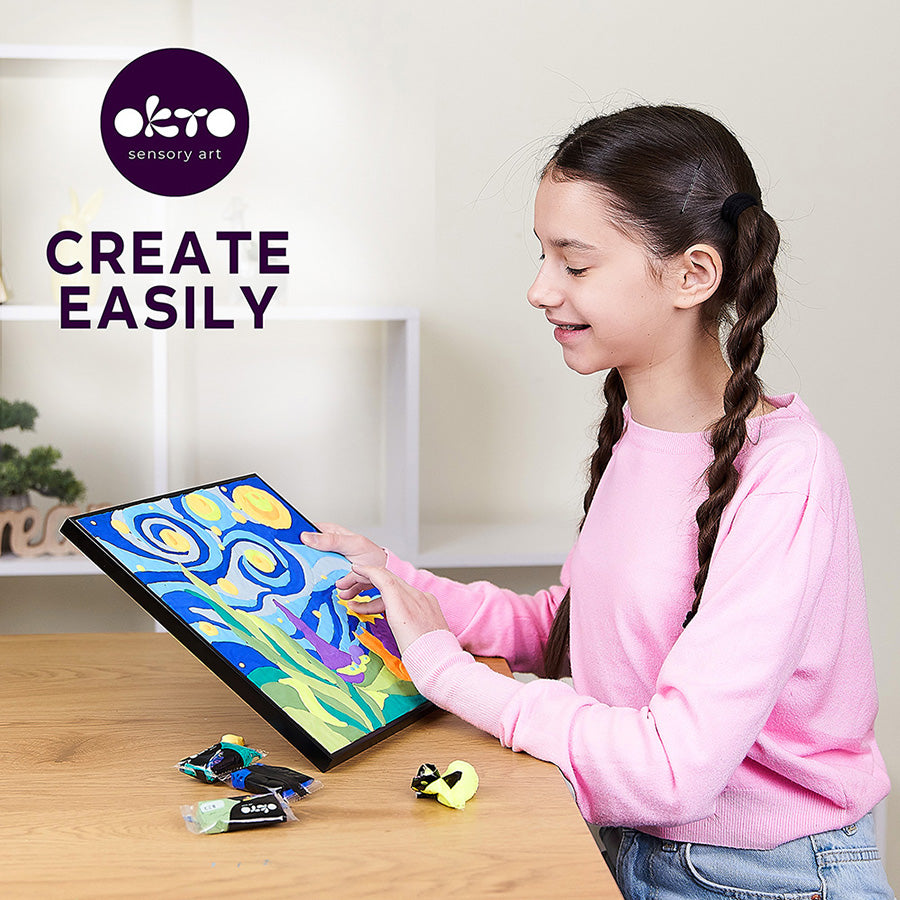 Het proces van het verspreiden van de pasta op de basis verlicht mentale stress, traint de aandacht, stabiliteit, zelfvertrouwen en geeft ook harmonie en esthetisch en tactiel plezier. Elke beweging en rotatie van de vinger van de auteur creëert een uniek volume en textuur die niet kan worden herhaald. Klei laat geen sporen achter op handen en harde oppervlakken.